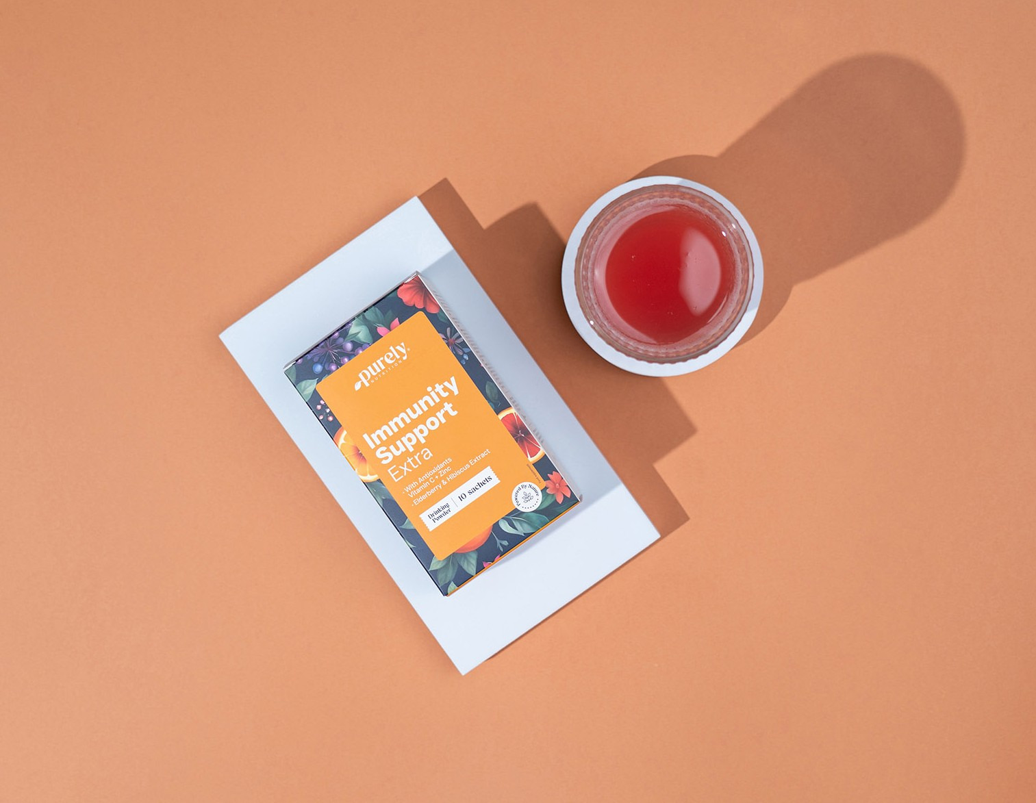Składniki: maltodekstryna, kwas L-askorbinowy (witamina C), koncentrat czarnej porzeczki w proszku 5%, koncentrat malin w proszku 3%, sole magnezowe kwasu cytrynowego, wyciąg z czarnego bzu (Sambucus nigra) 2%, wyciąg z kwiatów hibiskusa (Hibiscus sabdariffa) 1%, aromaty, bisglicynian cynku, substancja przeciwzbrylająca: dwutlenek krzemu, słodzik: sukraloza.